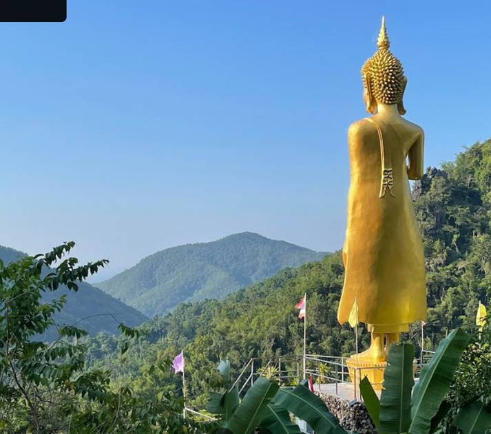 After visiting the temple complex follow the exit signs to route 1024 and proceed down  to the Golden Rock Temple.  You will see signs with photos just before the entrance.  You fork left and after a 300 meter climb there is a parking area on your right. Park and follow the paths to your right to view the temple figures and take in the scenic mountain views.